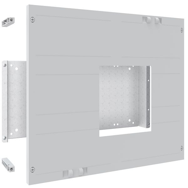 Modulbausatz in tiefer Bauform, für Leitsungstrenner NS1600 4-polig, mit und ohne Motorantrieb, zur Montage in der mittlere Position im Schrank, Kabeleinspeisung von unten bestehend aus: Montageplatte für Lasttrennschalter, 4 Abdeckplattenhalter, Abdeckplatte mit Öffnung für Leistungstrenner, Feldbreite 2 / Bauhöhe 3