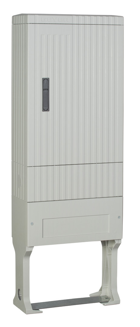 aus glasfaserverstärktem Polyester, lichtgrau RAL 7035, Schutzart IP44, nach DIN 43629, mit Tür vorgerichtet für Doppelschließung, ein Profilhalbzylinder werkseitig eingebaut, Montageplatte eingebaut