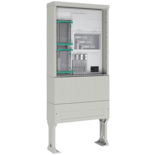 bestehendAus: Gehäuse,H xB xT (mm): 2010 x838 x277: Glasfaser verstärktes Polyester FS 833,5 nach DIN 16913,IP44,ähnlich RAL 7035,Mit Feldmontageset,Tür mit Doppelschließung und einem Profilhalbzylinder mit 2 Schlüsseln,Mit integriertem Sockel,Leistungsteil,H xB (mm): 1200 x500: NetzseitigerAnschlussraum (NAR),H xB (mm): 600 x250,Netzseitige Trennstelle: NH1-Sicherungslasttrennschalter,3-polig schaltbar,Wandlerraum,H xB (mm): 300 x500,mit Wandlerlasche (170 x30 x5mm) gemäß FormA nach DIN VDE 0603-2-2,Bohrungsabstand 130mm und plombierbarerAbdeckung mit Klarsichthaube,AnlagenseitigerAnschlussraum (AAR),H xB (mm): 600 x250,mit Leerplatz für Überspannungsschutz,Anlagenseitige Trennstelle: Lasttrennschalter,250A,3-polig,auf Montagetraverse (M8) und mit N+PE-Anschlusslasche,APZ-Raum: H xB (mm): 300 x250,mit LexCom Home-Mediamontageplatte und Gerätetragschiene,ohne Gerätebestückung,NetzseitigerAnschlussraum (NAR),H xB (mm): 300 x250,mit perforierterAbdeckplatte und 2xGerätetragschiene,ohne Gerätebestückung,Messteil,H xB (mm): 1200 x250: Wandlerzusatzraum,H xB (mm): 300 x250,mit perforierter 3-Punkt-Haube,bestückt mit Spannungspfadsicherung 3xLS-Automat B 10A/25 kA und Prüfklemme (X4) gemäß TAB Netze BW,Wandler-Zählerplatz,H xB (mm): 375 x250,3-Punkt mit Sekundärverdrahtung und IP54-Klarsichthaube,TRE-Platz,H xB (mm): 375 x250,3-Punkt mit Steuerverdrahtung und IP54-Klarsichthaube,AnlagenseitigerAnschlussraum (AAR,über TRE),H xB (mm): 150 x250,mit perforierter 3-Punkt-Haube und Gerätetragschiene,ohne Gerätebestückung