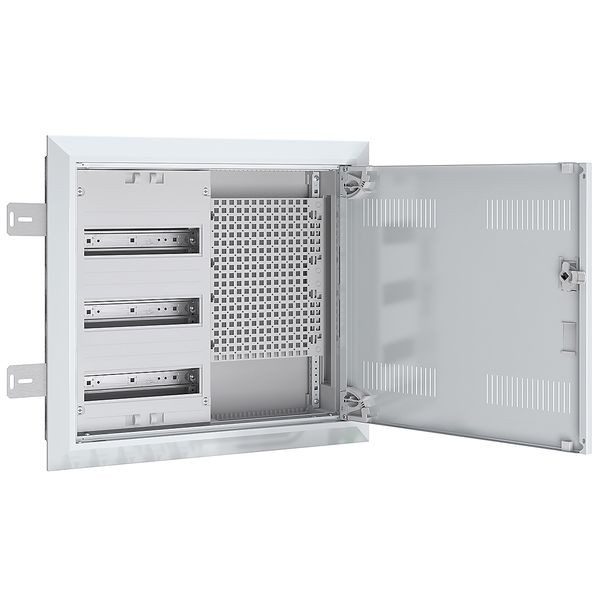 Komplettschrank für Unterputz- und Hohlwand- Montage bestehend aus: Blendrahmen inkl. Tür mit Lüftungsschlitzen, 1x Verteilerfeld 3-reihig, 1x Multimediafeld LexCom Home bestehend aus: 2x vollflächige Multimedia-Montagefläche zur Aufnahme von LexCom Zubehör in Steck- und Schraubtechnik