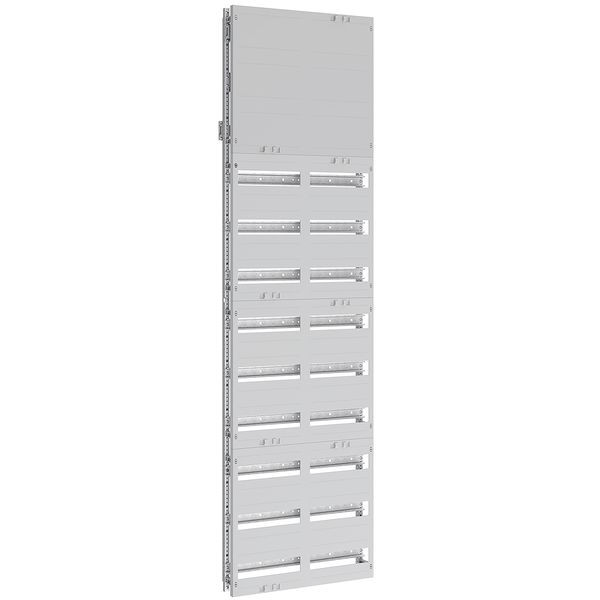 Verteilerfeld bestehend aus: 1x Verteilerfeld 2x 12-reihig in flacher Bauform, 18 Reihen mit 216 TE für Reiheneinbaugeräte in 150 mm Abstand, 6 Reihen isoliert und höhenversetzt aufgebaut für Reihenklemmen