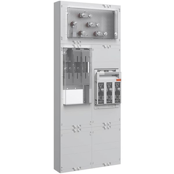 bestehendAus: NetzseitigerAnschlussraum (NAR),mit netzseitiger Trennstelle,H xB (mm): 750 x250: NH2-Sicherungselement,3x1-polig,auf Montagetraverse,mit Hauptstromverdrahtung 150mm² zum Wandlerraum und N+PE-Anschlusslasche,Wandlerraum,H xB (mm): 450 x500: Mit Isolatoren,Primärverdrahtung 150mm²Auf Cu-Anschlusslaschen und plombierbarerAbdeckung mit Klarsichthaube,Für bauseitige Norm-Wandlerlasche 170mm lang gemäß FormA nach DIN VDE 0603-2-2,Bohrungsabstand 130mm,AnlagenseitigerAnschlussraum (AAR),H xB (mm): 750 x250: Mit Leerplatz für Überspannungsschutz,Anlagenseitige Trennstelle: NH2-Sicherungslasttrennschalter,3-polig schaltbar,auf Montagetraverse (Universalanschluss M10) und N+PE-Anschlusslasche