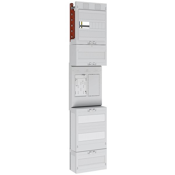 bestehendAus: NetzseitigerAnschlussraum (NAR,oben),H xB (mm): 300 x250: Mit 40mm Sammelschienen,355A,5-polig (Cu 2x12 x5mm),Vorbereitet für den Einbau von SH-Schalter und Überspannungsschutz,VNB-Zusatzraum,H xB (mm): 150 x250: Mit perforierter 3-Punkt-Haube und Gerätetragschiene,ohne Gerätebestückung,Zählerplatz,H xB (mm): 300 x250: Mit 1xeHZ-Kassette (BKE-I),44A,16mm²,AnlagenseitigerAnschlussraum (AAR),H xB (mm): 300 x250: Mit perforierter 3-Punkt-Haube und 2xHauptleitungsabzweigklemme 5 x25mm²Auf Gerätetragschiene
