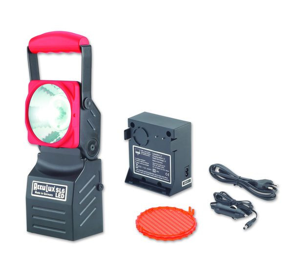AccuLux SL 6 LED Set (Art.Nr. 456543, schwarz/rot)S uperlicht durch ausfallsichere 3 W PowerLED + Linsenfokus als Hauptlicht; kein Lampenwechsel mehr; Handscheinwerfer mit separatem Ladeteil: in Gebäuden oder Fahrzeugen montierbar; sehr praktisch: durch die schnelle Ein- und Ausrastfunktion des Ladeteils kann die Leuchte schnell abgenommen werden; ohne Notlichtfunktion; Schutzart IP 54 (Leuchte); Blinklichtfunktion; sehr leicht: nur ca. 1100g; Leuchtenkopf 110° schwenkbar; Akku-Kapazitätsanzeige; Set inkl. Ladestation, Netzkabel 230 V, Kfz-Ladekabel 12/24V, Vorsatzscheibe orange