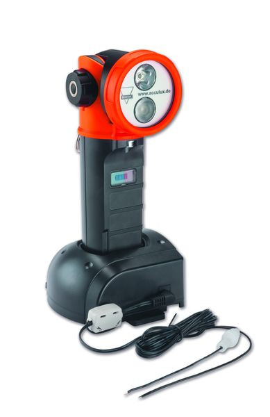 AccuLux HL 25 EX Set 12/24V + 230V (Art.Nr. 458591, orange) Aufladbare Knickkopf-Leuchte mit sehr hoher Leuchtkraft; 2-stufig schaltbar: 3 W LED (ca. 170 Lumen) für den Fernbereich und 1 W LED (ca. 90 Lumen) für den Nahbereich; Notlichtfunktion schaltbar, austauschbarer Lithium-Ionen-Akku mit Restkapazitätsanzeige, 4-stufig verstellbarer Leuchtenkopf; EX-Zonen: 1, 2, und 21, 22; Schutzart: IP 67 (Leuchte): tauchfähig bis 1 m Tiefe (zeitweise); Gewicht: ca. 540 g