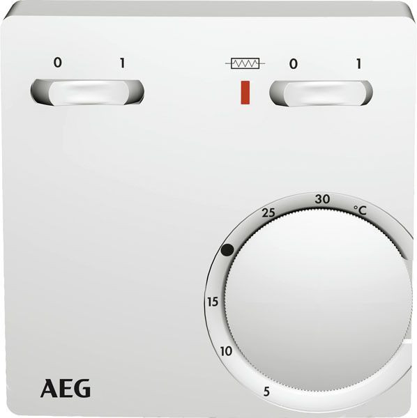 Raumtemperaturregler mit Netzschalter und Schalter Zusatzheizung. LED Anzeige für Betrieb Zusatzheizung. Temperatureinstellung 5 °C bis 30 °C. Mit 1-poligem Netzschalter EIN/AUS. Bimetallregelung mit thermischer Rückführung. Mit einstellbarer Bereichseinengung. Aufputzmontage oder direkt auf UP-Dose.