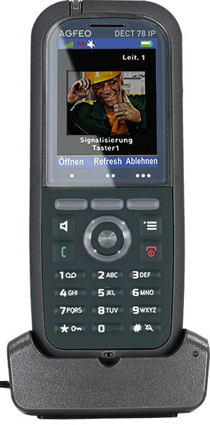 DECT-Handgerät für die AGFEO DECT IP-Basis! Gehäusegummiummantelung, staubdicht, ölresistent, stoß- und wasserfest nach Schutzklasse IP65, geeignet für den antibakteriellen Einsatz nach ISO 22196 (2nd Edition)! Nur 12,2 cm groß, Folientastatur, 2" Farbdisplay, Bluetooth 4.1 (Headsetanbindung), Einsatzbereich -10 bis +55 Grad. Zentrale Notruftaste für individuelle Anwendungen. CLIP Funktion (Name und Nummer), lokales Telefonbuch (250 Kontakte), Zugriff auf zentrales Telefonbuch des DECT IP-Systems, Lauthören, Freisprechen, Vibrationsalarm, Anruflistenfunktion, Headsetbuchse 3,5 mmMerkmale