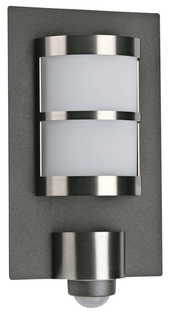 aus Edelstahl mit opalem Glas, Montageplatte aus Aluminiumguß. Eingerichtet für 1 x Glühlampe A60 75 W, Fassung E27.Schutzart IP 44 - Schutzklasse : Bicolor - Edelstahl / Anthrazit Abmessungen: 200 x 345 x 95 mm