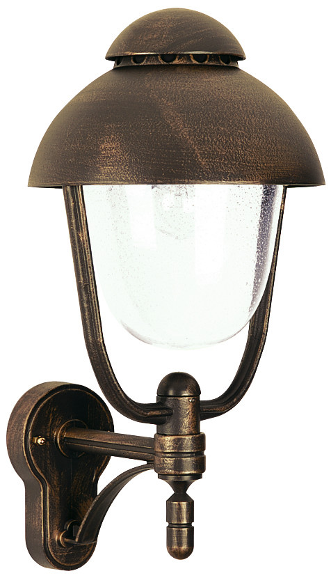 aus korrosionsbeständigem Aluminiumguß mit Blasenglas klar. Eingerichtet für 1 Glühlampe A 60 75W, Fassung E 27.Mit zusätzlichem Wandschild zum : braun- IP 44 - Schutzklasse : d 250 x 510 x 320 mm