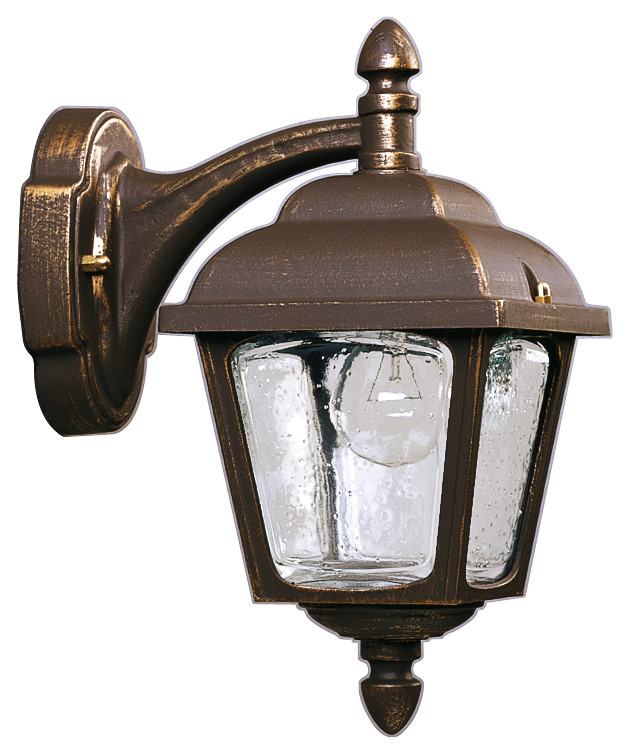 aus korrosionsbeständigem Aluminiumguß mit klarem Hohlglas. Eingerichtet für 1 Glühlampe A 60 75W, Fassung E 27.Mit zusätzlichem Wandschild zum : braun- IP 44 - Schutzklasse : 170 x 245 x 350 mm