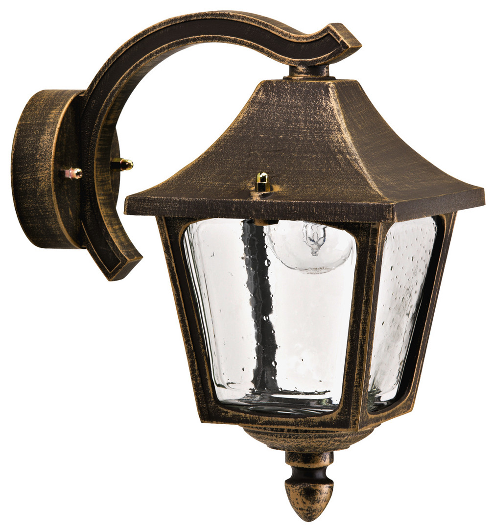 aus korrosionsbeständigem Aluminiumguß mit klarem Hohlglas. Eingerichtet für 1 Glühlampe A 60 75W, Fassung E 27.Mit zusätzlichem Wandschild zum : braun- IP 44 - Schutzklasse : 175 x 265 x 320 mm