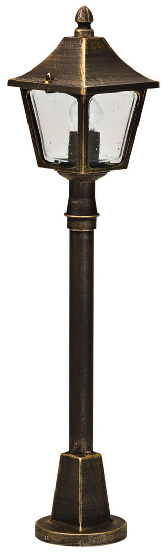 aus korrosionsbeständigem Aluminiumguß mit Hohlglas klar. Eingerichtet für 1 Glühlampe A60 75W, Fassung E 27.Mit Mast, anschlußfertig zur Montage auf ein Fundament oder dem Erdeingrabsockel 690010.Farbe: braun- IP 23 - Schutzklasse : 175 x 175 x 850 mm