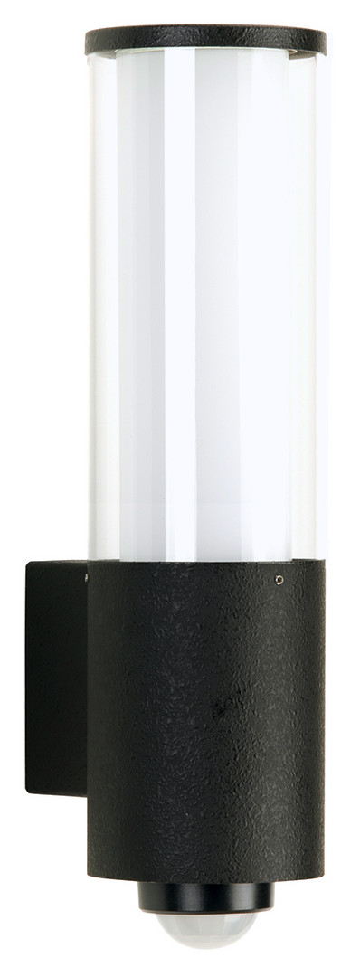 Albert-Wandleuchte 660320 - mit integriertem Bewegungsmelder - aus Aluminiumguss mit opalem Glas und Acrylglaszylinder klar. Eingerichtet für 1 x Lampe max. 18W, Fassung E27,Mit Montageplatte aus Aluminiumguss Farbe: schwarz Schutzart IP 44 - Schutzklasse : d 100 x 145 x 400 mm