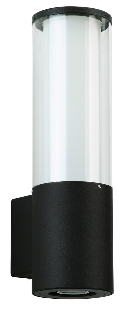 Albert-Wandleuchte 660321 - mit zus. Unterlicht - aus Aluminiumguss mit opalem Glas und Acrylglaszylinder klar. Eingerichtet für 1 x Lampe max. 18W, Fassung E27,sowie für 1 x PAR 16 50W für Fassung GU10.Mit Montageplatte aus Aluminiumguss Schutzart IP 44 - Schutzklasse : schwarz Abmessungen: d 100 x 145 x 385 mm