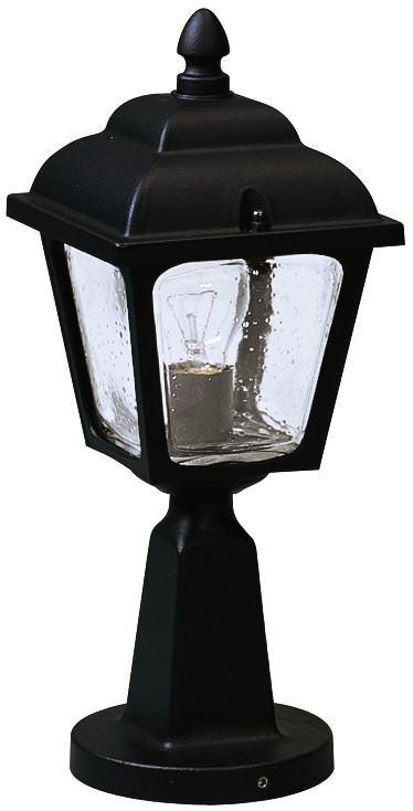 Albert-Sockelleuchte 660536 aus korrosionsbeständigem Aluminiumguß mit Hohlglas klar. Eingerichtet für 1 x Lampe 75W, Fassung E 27. Anschlussfertig zum aufschrauben auf ein Fundament oder auf den Erdeinbausockel Typ Nr. 690011.Farbe: schwarz Schutzart IP 23 - Schutzklasse : 170 x 440 mm
