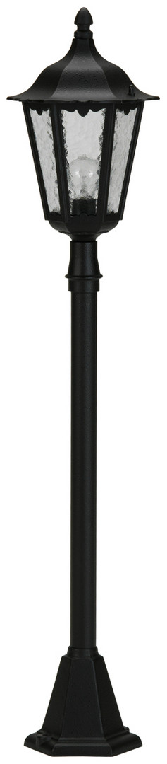 auskorrosionsbeständigem Aluminiumguß mit klarem Kathedralglas. Eingerichtet für 1 Glühlampe A60 75W, Fassung E 27.Mit Mast, anschlußfertig zur Montage auf ein Fundament oder dem Erdeingrabsockel 690011.Farbe: schwarz Schutzart IP 23 - Schutzklasse : d 230 x 1130 mm