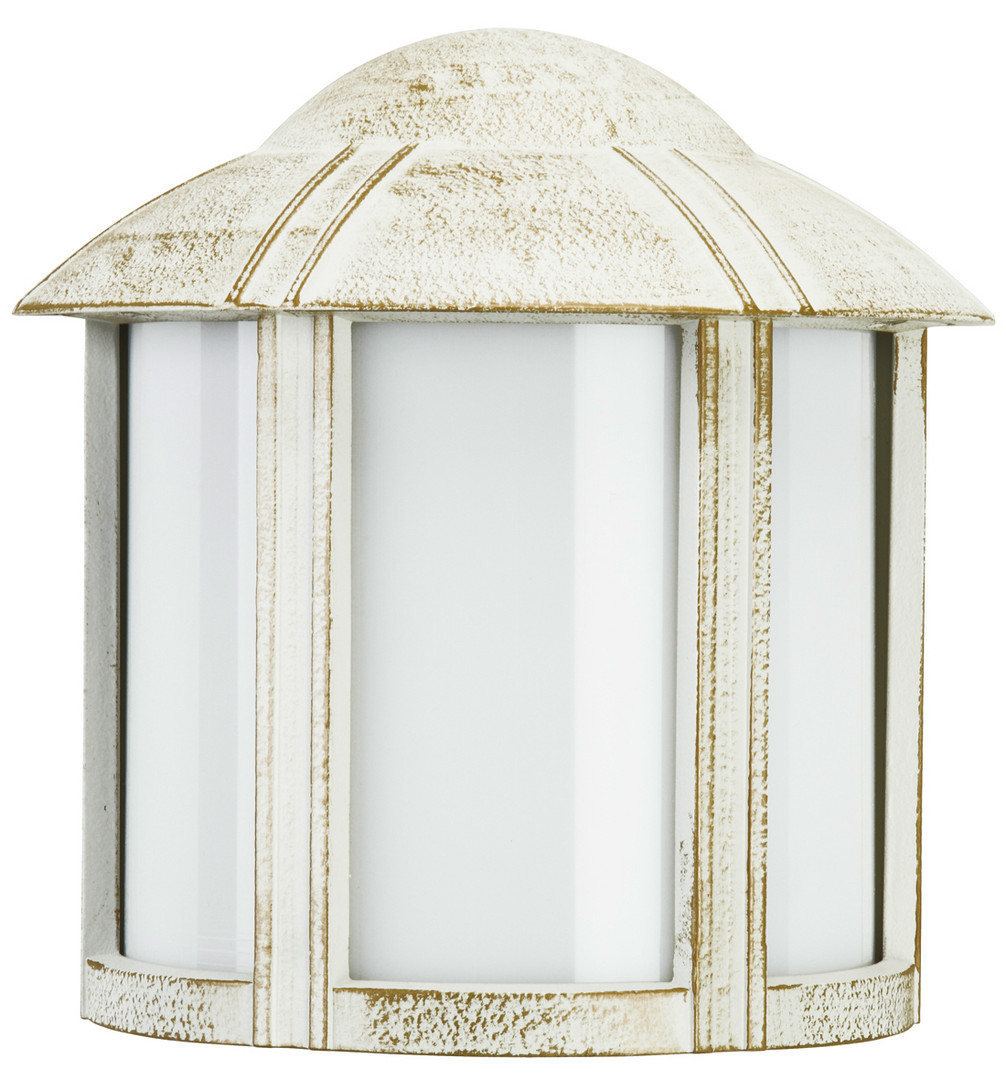 aus korrosionsbeständigem Aluminiumguß mit Acrylglas Opal. Eingerichtet für 1 Glühlampe A 60 75W, Fassung E 27.Farbe: weiß- IP 44 - Schutzklasse : 240 x 130 x 235 mm