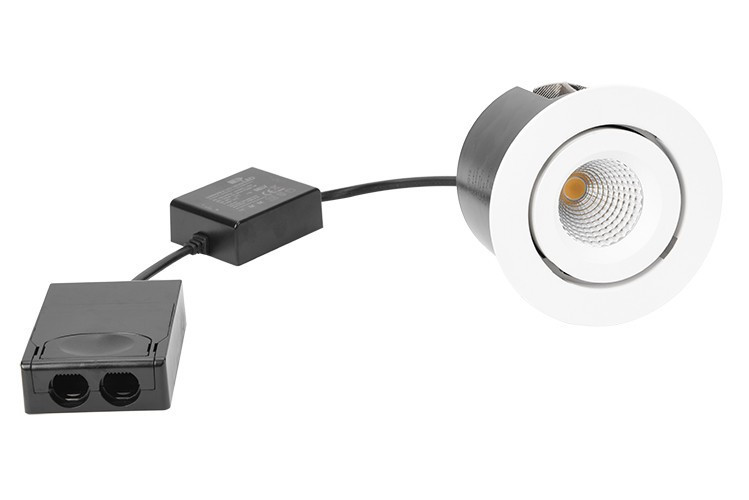 EVO12-Downlight, mit einer Lichtqualität, die der der RA97-Glühbirne entspricht, dimmbar und mit 45-Grad-Neigungsfunktion.