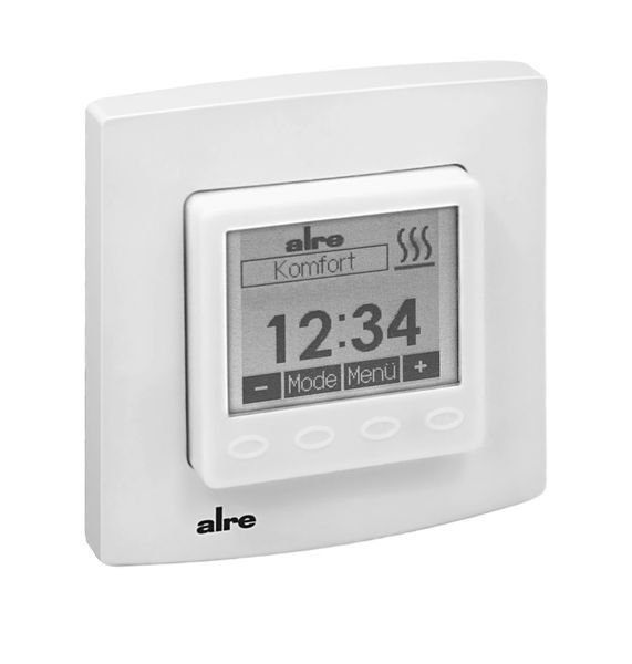 | Kurzbeschreibung | Raum-/Fußbodentemperaturregler mit Uhr, UP, alre-Rahmen, Abdeckung 50 x 50 mm, reinweiß, glänzend, Fernfühler NTC2K für Fußboden |