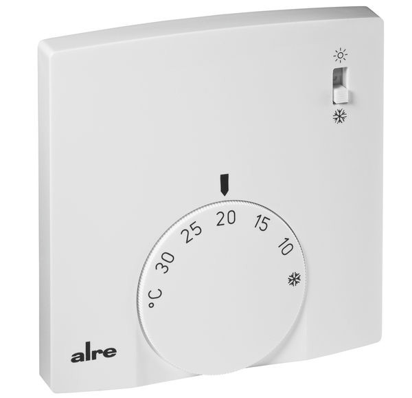 Elektromechanischer Raumtemperaturregler im superflachen Aufputzgehäuse (nur 13,9 mm tief) zur Regelung oder Überwachung von Temperaturen in Büros, Wohnräumen und Hotels. Durch die thermische Rückführung wird eine sehr genaue Schaltdifferenz erreicht. Mit der unter dem Einstellknopf befindlichen Bereichseinengung kann der Einstellbereich verändert werden. Das Gerät wird mittels Aufputz-/Wandmontage (4-Loch-Befestigung auf UP-Dose) montiert. Geeignet für 2-Rohr Anlagen, vor allem Wärmepumpen. Die Heiz-/Kühlumschaltung erfolgt mit einem Schalter am Gerät.