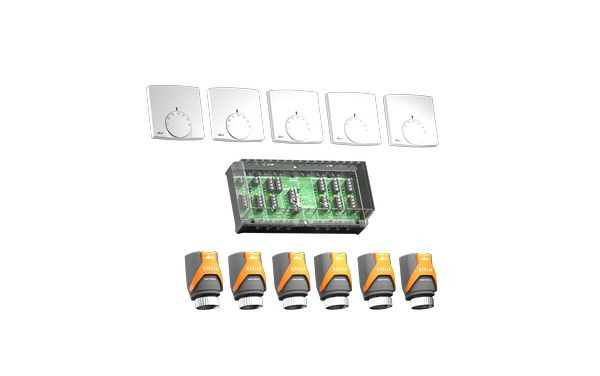 | Kurzbeschreibung | Set für den vollautomatischen hydraulischen Abgleich bestehend aus 5 Aufputz-Raumthermostaten, 1 Klemmenleiste und 6 Stellantrieben. |