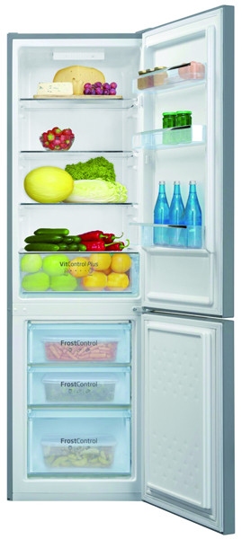 VitControl Plus Line. Edelstahloptik, elektronische Steuerung, Inverter Kompressor, Superkühlfunktion, Supergefrierfunktion, silberne Applikationen im Innenraum. Nutzinhalt total: 262 l, Kühlen: 187 l, Gefrieren: 75 l. Kühlen: Abtauung: automatisch, 3 Glasablagen, 1 VitControlPlus Schublade, 3 Türablagen, LED-Innenbeleuchtung, oben, Eiertablett. Gefrieren: FrostControl, Abtauung: manuell, FlexOn, 3 Gefrierschubladen, 2 Gefrierfach-Ablagen, Eiswürfelbehälter
