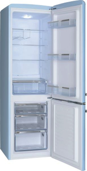 mechanische Steuerung, Kühlteil: LED-Beleuchtung, 3 höhenverstellbare Ablagen aus Sicherheitsglas, 1 Obst- und Gemüseschublade mit Glasabdeckung, Gefrierteil: manuelle Abtauung, 3 transparente Schubladen, Türanschlag rechts, Retro-Design