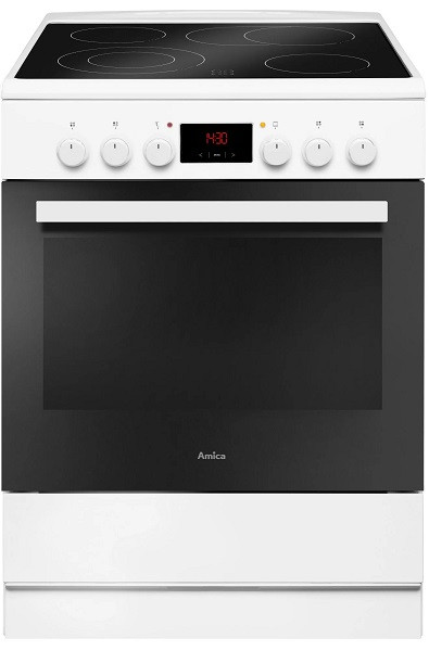 Das weiße Fine Design Modell bietet einen 65-Liter-Backofen mit 9 Funktionen, Umluft und CoolDoor3 Leichtreinigungstür. Es verfügt über SensorControl Timer, versenkbare Knebel, Halogenbeleuchtung, Steam Clean Reinigung und 1fach Teleskopauszug. Das Glaskeramik-Kochfeld hat 4 TopSpeed Kochzonen mit Zweikreis- und Bräter-Zone, Leistungen von 0,75 bis 2,2 kW. Der Herd hat Energieeffizienzklasse A, misst 850 x 600 x 600 mm, wiegt 46 kg und hat 9,70 kW Anschlusswert bei 400 V. Backblech und Grillrost sind inklusive