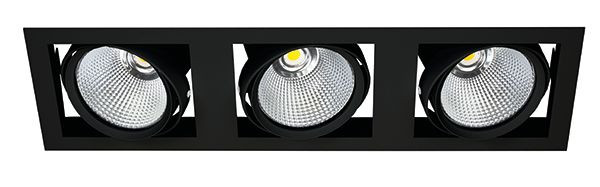 Elegante LED Kardaneinbauleuchte für hohe Ansprüche im Retail, 3-fach. Rahmen pulverbeschichtet. Facettierter Reflektor für optimale Lichtverteilung. Schwenkbereich 20°. Farbtoleranz 3 SDCM. Lichtstromrückgang nach 50.000h L80/B20. Separates, nicht dimmbares Betriebsgerät. 5 Jahre Garantie.