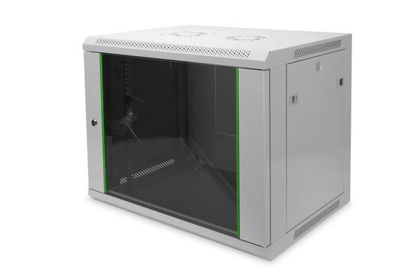 Die Netzwerkschränke zur Wandmontage der Dynamic Serie wurden für einen einfachen und besonders kostenoptimierten Netzwerkausbau entwickelt. Dach, Boden und Rückwand eines jeden Schrankes sind mit einem vorgestanzten Kabeleinlass ausgestattet. Für die Aufnahme eines Lüftermoduls wird das Dachchassis ebenfalls mit einem ausgestanzten Bereich versehen. Zwei Paar galvanisierte, mit in beide Richtungen ablesbare Höheneinheiten beschriftete 483 mm (19")-Profilschienen sind im Inneren verbaut. Diese lassen sich in der Tiefe verstellen. Jeder Schrank ist eine robuste Stahlkonstruktion aus bis zu 1,5 mm starkem Stahlblech. Die Farbgebung erfolgt in Form von elektrostatischer Pulverbeschichtung in den Standardfarben Grau (RAL 7035) und Schwarz (RAL 9005). Abnehmbare Seitenwände sowie die abschließ- und abnehmbare Fronttür, verbessern die Zugänglichkeit. Ein Türanschlagswechsel kann vorgenommen werden. Die Wandmontage erfolgt in zwei einfachen Arbeitsschritten: Das mitgelieferte Montageblech wird an die Wand geschraubt und im Anschluss mit dem Gehäuse verbunden.