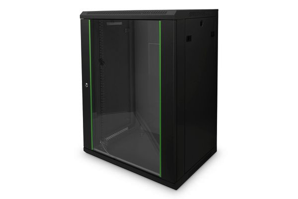 Die Netzwerkschränke zur Wandmontage der Dynamic Serie wurden für einen einfachen und besonders kostenoptimierten Netzwerkausbau entwickelt. Dach, Boden und Rückwand eines jeden Schrankes sind mit einem vorgestanzten Kabeleinlass ausgestattet. Für die Aufnahme eines Lüftermoduls wird das Dachchassis ebenfalls mit einem ausgestanzten Bereich versehen. Zwei Paar galvanisierte, mit in beide Richtungen ablesbare Höheneinheiten beschriftete 483 mm (19")-Profilschienen sind im Inneren verbaut. Diese lassen sich in der Tiefe verstellen. Jeder Schrank ist eine robuste Stahlkonstruktion aus bis zu 1,5 mm starkem Stahlblech. Die Farbgebung erfolgt in Form von elektrostatischer Pulverbeschichtung in den Standardfarben Grau (RAL 7035) und Schwarz (RAL 9005). Abnehmbare Seitenwände sowie die abschließ- und abnehmbare Fronttür, verbessern die Zugänglichkeit. Ein Türanschlagswechsel kann vorgenommen werden. Die Wandmontage erfolgt in zwei einfachen Arbeitsschritten: Das mitgelieferte Montageblech wird an die Wand geschraubt und im Anschluss mit dem Gehäuse verbunden.