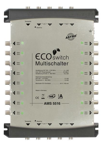 Kaskadierbarer Multischalter für das AMS 5er Ecoswitch-System (Erweiterungsgerät), 5 Eingänge für eine Satellitenposition plus Terrestrik, 16 Teilnehmerausgänge