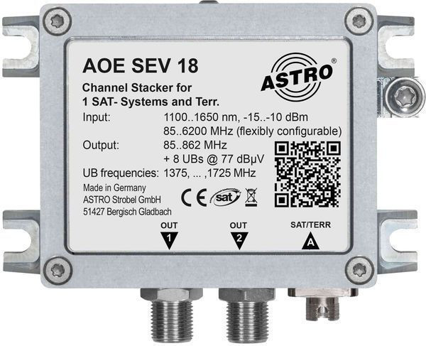 Einkabelumsetzer für 1 Satelliten und Terrestrik, 1 optischer Eingang FC/PC, 2 F-Ausgänge für 8 Userbänder, flexibel konfigurierbar