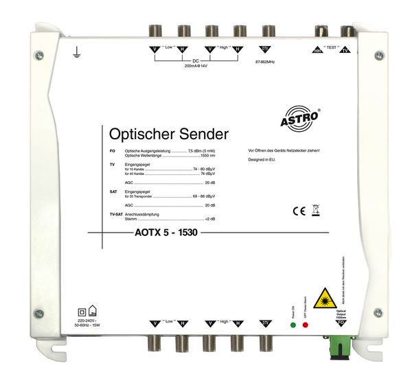 Optischer Sender, 5 mW Ausgangsleistung, Wellenlänge 1530 nm, elektrische Eingänge für Direktanschluss eines Standard-LNB, mit LNB-Versorgung 14 V, 200 mA und terrestrischem Eingang, optischer Ausgang 7 dBm mit SC/APC-Konnektor und AGC, integriertes Netzteil