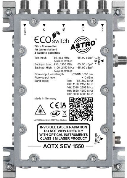 Optischer Sender, Wellenlänge 1550 nm, elektrische Eingänge für Direktanschluss eines Quatro-LNB, mit LNB-Versorgung 9 V und terr. Eingang, optischer Ausgang 10 dBm mit FC/PC-Konnektor und AGC, inkl. Netzteil SEV NT