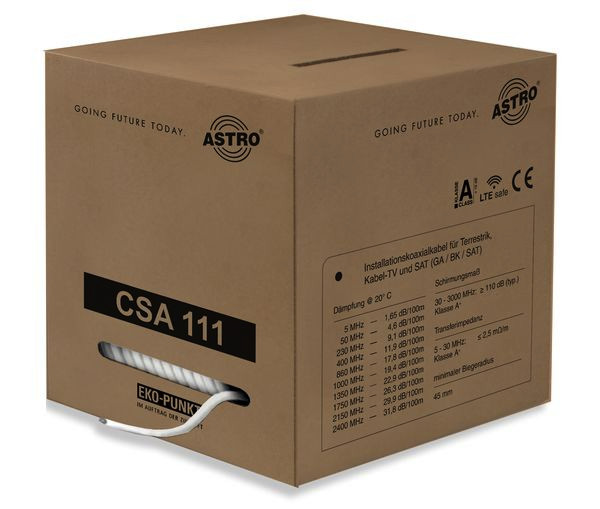 Koaxialkabel, 3-fach geschirmt (2x AL-Folie + AL-Geflecht), 250 m Abrollbox, 1,13 mm massiver Kupferinnenleiter, 6,9 mm Mantel PVC weiß, Class A+, Brandschutzklasse Eca