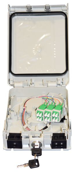 FTTH AP Wandgehäuse, 6x LC/APC-Dupl. E9/125 G657A.1 OS2, kompl. bestückt für Crimpspleisschutz, inkl. 6x LC/APC-Dupl. Keramikkupplung grün inkl. 12x LC APC-Faserpigtail LC/APC E9/125 G657A.1, inkl. Spleißhalter für 12 Spleiße, versiegelbar, abschließbar mit Schloss Aufnahme Gas-Wasser-Stop, IP 54