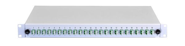 Spleißbox 19", 1HE, Stahl, Schubladenauszug, 24x LC/APC-Dupl. E9/125 OS2 kompl. bestückt (24er Front), inkl. 24x LC/APC-Dupl. Keramikkupplung grün, inkl. 48x LC/APC-Faserpigtail E9/125, 2 m, inkl. 4x Spleißkassette, Halter, Deckel, 1x PG, spleißfertig abgelegt und abgesetzt