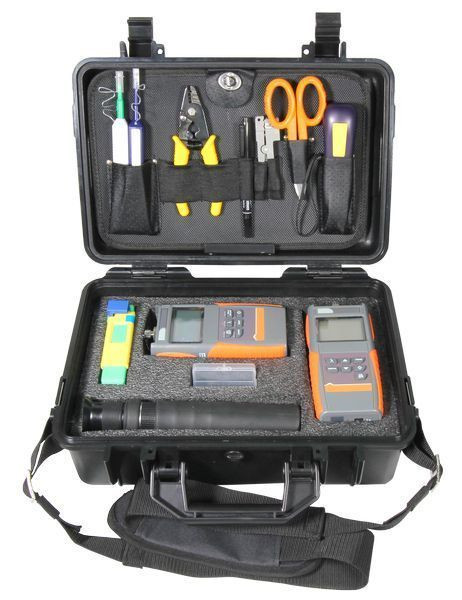 Service-Set für FTTH Installationen, Glasfaser Service Koffer (Reinigung und Inspektion), enthält alle erforderlichen Tools zum Testen und Reinigen von Glasfasern, zum Messen von Faserverlusten, zur visuellen Fehlerortung, zur Inspektion und Reinigung von Steckverbindern, sehr stabiler Kunststoff-Tragekoffer mit abnehmbaren Tragegurt, AC/DC-Adapter zum Aufladen von 2xAA-Batterien, optischer Pegelmesser (bis +26 dBm), SC und FC Adapter, USB-Kabel, AC/DC-Adapter für optischen Pegelmesser, optischer Testsender (1310 nm/1550 nm @-5 dBm, +/-3 dB einstellbar) SC/FC Adapter, DC 6 Volt-Adapter für optischen Testsender, 1,25 mm Reinigungsstift für LC Kupplungen und Pigtails, 2,5 mm Reinigungsstift für SC oder FC Kupplungen und Pigtails, Reinigungskassette für Pigtails, 3 Loch Fibre Stripper Zange (1.6-3 mm Mantel, 600-900 ?m Buffer und 250 ?m Coating), Schwarzer Marker, Buffer Stripper Zange für 2mm oder 3mm, Visuelle Laserquelle (Rotlichtquelle), 2x AAA Batterien (nicht im Lieferumfang), 400 x Mikroskop für Oberflächenbetrachtung der Pigtails für LC, SC und FC, 3x AAA Batterien (nicht im Lieferumfang)