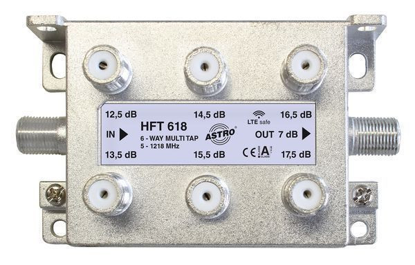 Abzweiger 6-fach, 5 - 1218 MHz, Abzweigdämpfung ca. 12,5…17,5 dB je nach Ausgang Durchgangsdämpfung ca. 7 dB, VFKD zertifiziert