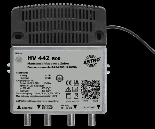 Breitbandverstärker mit 204 MHz Rückweg, Vorweg bis 1218 MHz, Verstärkung Vorweg 42 dB, Ausgangspegel Vorweg 102 dBuV, Verstärkung Rückweg 30 dB, Ausgangspegel Rückweg 108 dBuV, diverse Einstellmöglichkeiten mittels Pads und Steckbrücken zur Konfiguration des Vor- und Rückweges