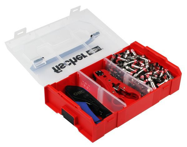 bestehend aus: 1 x KRA 07 Koaxabsetzwerkzeug, 100 x FKS 06 QM Quick-Kompressionsstecker, 1 x KRZ 05 Kompressionszange, 1 x Werkzeugkiste aus schlag- und stoßfestem Polypropylen