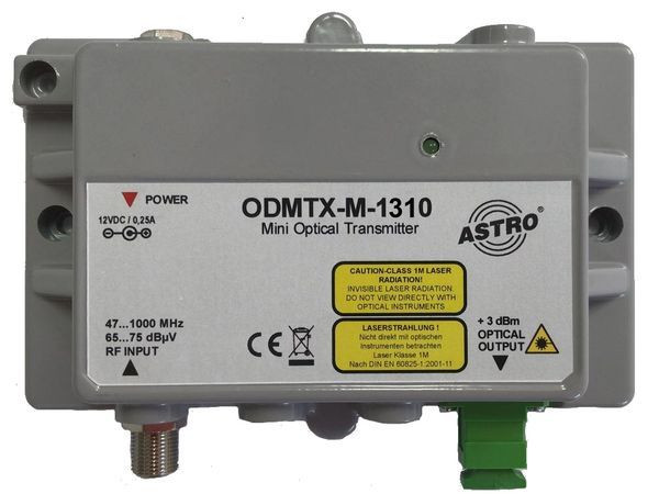 Direkt modulierter optischer Mini-Sender, 1310 nm, optische Ausgangsleistung 1 x 3 dBm, optischer Anschluss: SC/APC, HF-Eingang: F-Buchse, Steckernetzteil beiliegend: 100 - 230 VAC, Ausgangsspannung: 12 VDC