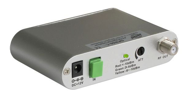 Optischer FTTH-Empfänger, Node zum Abschluss von RF-Overlay Netzen, Bereich -10 bis 0 dBm, Ausgangspegel größer 80 dBuV, 20 dB Dämpfungssteller für den HF-Pegel, 12 V Steckernetzteil, SC/APC Konnektor, optische Wellenlänge 1100 - 1600 nm