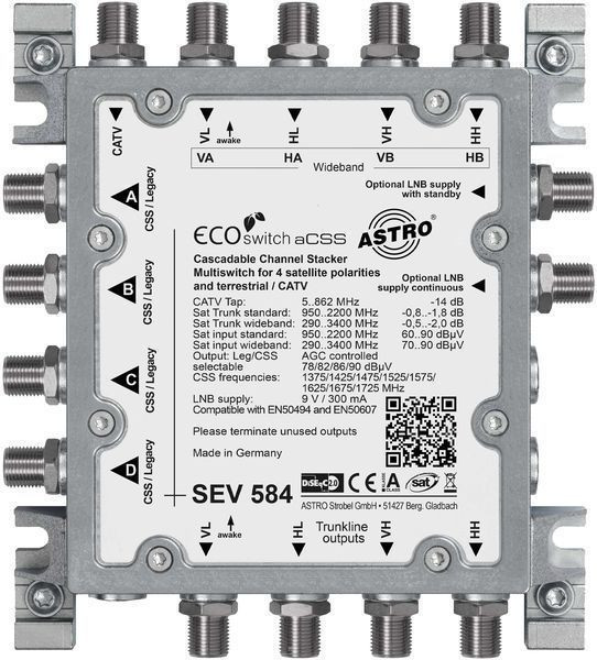 Einkabelumsetzer für 1 (2) Satelliten und Terrestrik, 5 F-Eingänge,4 F-Durchschleifausgänge, 4 F-Ausgänge für je 1 Legacy oder 8 Userbänder, 2 F-Eingänge für optionales Netzteil, SAT kaskadierbar, LNB und Einkabelumsetzer komplett receivergespeist