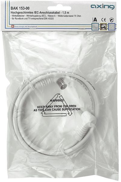 Anschlusskabel IEC, Winkelstecker, Winkelkupplung, hochgeschirmt, 1,50 m Schirmungsmaß gemäß EN 60966-2-5, Klasse A Weiß, im Polybeutel mit SB-Verschlusskarte