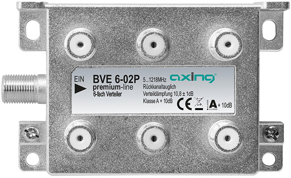 6-fach Verteiler, 5 - 1218 MHz, Bauform 02 Hohe Rückflussdämpfung Multimedia-tauglich Ein- und Ausgänge brummentkoppelt Hohe Intermodulationsfestigkeit Schirmungsmaß Klasse A +10 dB, gemäß EN 50083-2 Rückflussdämpfung und Entkopplung gemäß VFKD TS 220 Vodafone Kabel Deutschland zugelassen