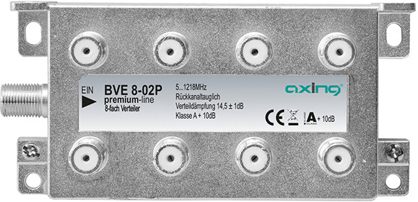 8-fach Verteiler, 5 - 1218 MHz, Bauform 02 Hohe Rückflussdämpfung Multimedia-tauglich Ein- und Ausgänge brummentkoppelt Hohe Intermodulationsfestigkeit Schirmungsmaß Klasse A +10 dB, gemäß EN 50083-2 Rückflussdämpfung und Entkopplung gemäß VFKD TS 220 Vodafone Kabel Deutschland zugelassen