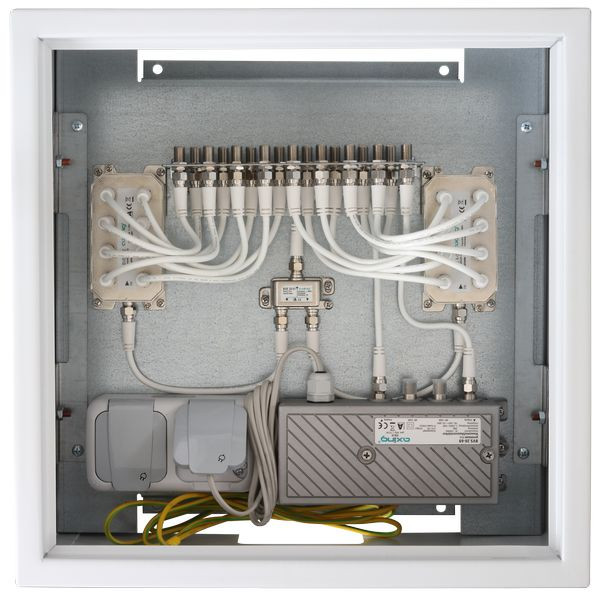 CATV-Montageschrank max. 16 Teilnehmer, komplett vormontiert 1 x BVS 20-69 CATV-Verstärker 38 dB, 107 dBµV CSO/CTB * 2 x BVE 8-02P 8-fach Verteiler, 5 - 1218 MHz * 1 x BVE 2-01P 2-fach Verteiler, 5 - 1218 MHz * 1 x QEW 17-50 Erdungswinkel * 19 x MAK 20-80 Patch-Kabel 1 x MAK 30-80 Patch-Kabel 1 x SZU 89-04 Doppelsteckdose 1 x QAS 4045 Montageschrank