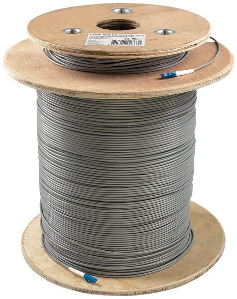 Optisches Kabel mit Stahlarmierung, LC/UPC, 500 m 500 m auf Holztrommel Konfektioniert mit LC/UPC-Steckern Typ Single-Mode Farbe grau